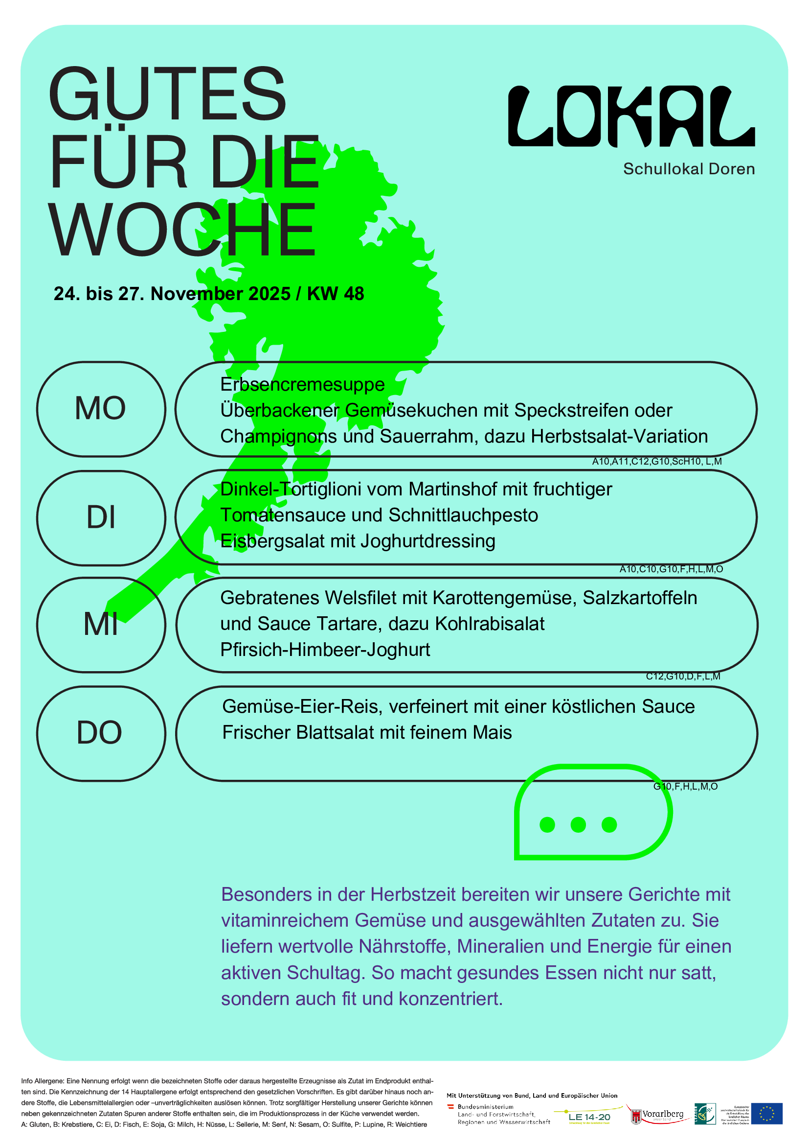 Der Speiseplan für die Folgewoche ist ab Freitag Mittag hier veröffentlicht. Das Küchenteam legt Wert auf Abwechslung mit möglichst regional, saisonal und nachhaltig erzeugten Lebensmitteln. Fertiggerichte, Soßenpulver und Fertigwürzen werden in den LOKAL Küchen nicht verwendet. Die Menüs werden täglich frisch zubereitet.
