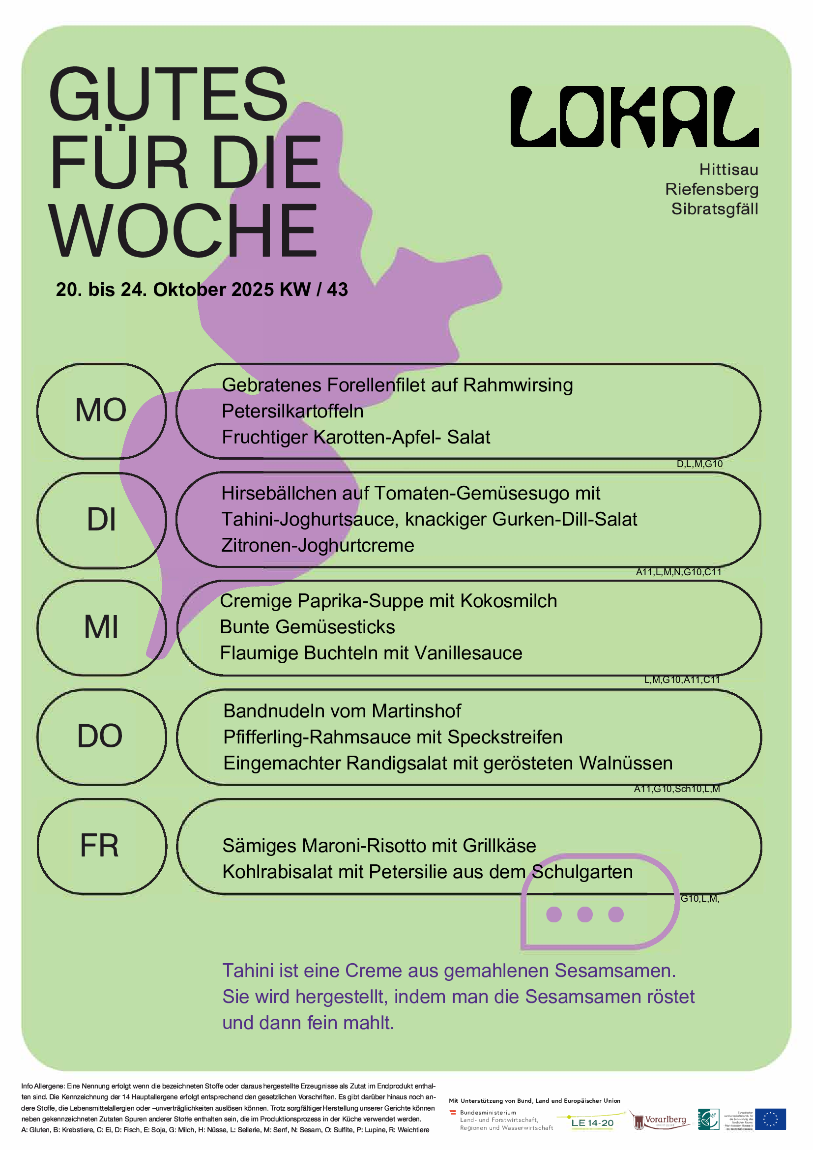 Der Speiseplan für die Folgewoche ist ab Donnerstag Abend hier veröffentlicht. Das Küchenteam legt Wert auf Abwechslung mit möglichst regional, saisonal und nachhaltig erzeugten Lebensmitteln. Fertiggerichte, Soßenpulver und Fertigwürzen werden in den LOKAL Küchen nicht verwendet. Die Menüs werden täglich frisch zubereitet.