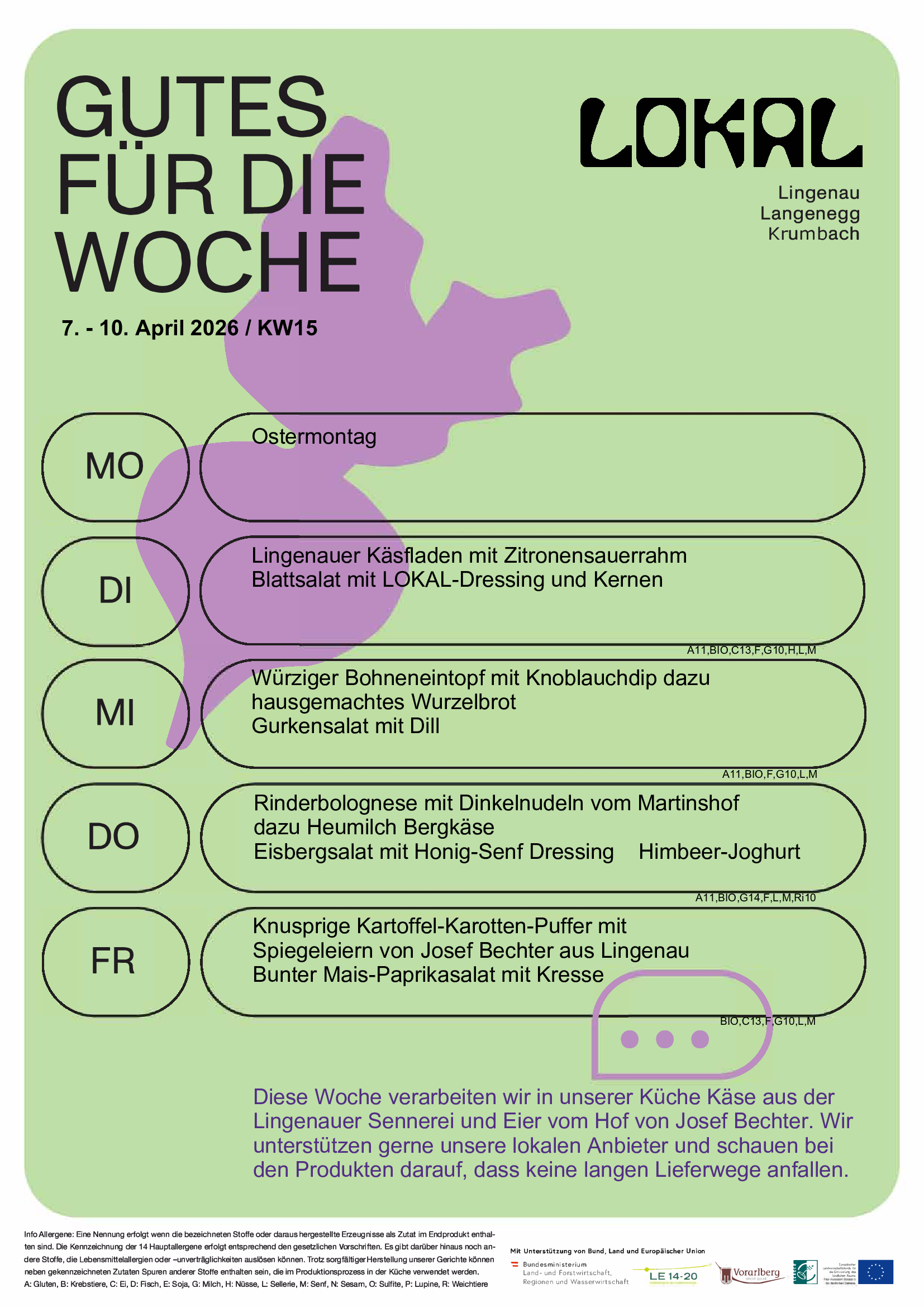 Der Speiseplan für die Folgewoche ist ab Donnerstag Abend hier veröffentlicht. Die LOKAL Küche Lingenau versorgt die Krumbacher Einrichtungen. Das Küchenteam legt Wert auf Abwechslung mit möglichst regional, saisonal und nachhaltig erzeugten Lebensmitteln. Fertiggerichte, Soßenpulver und Fertigwürzen werden in den LOKAL Küchen nicht verwendet. Die Menüs werden täglich frisch zubereitet.