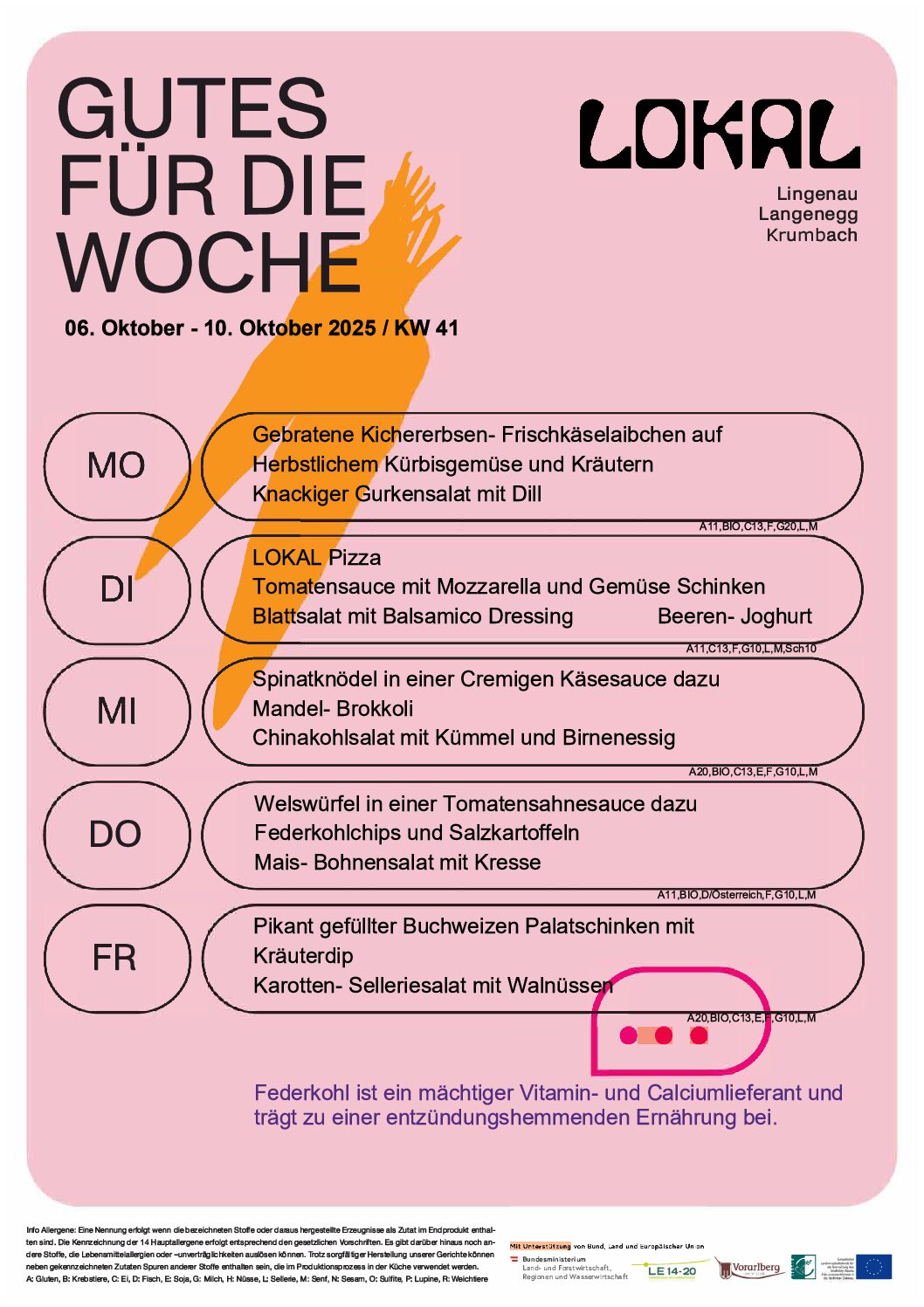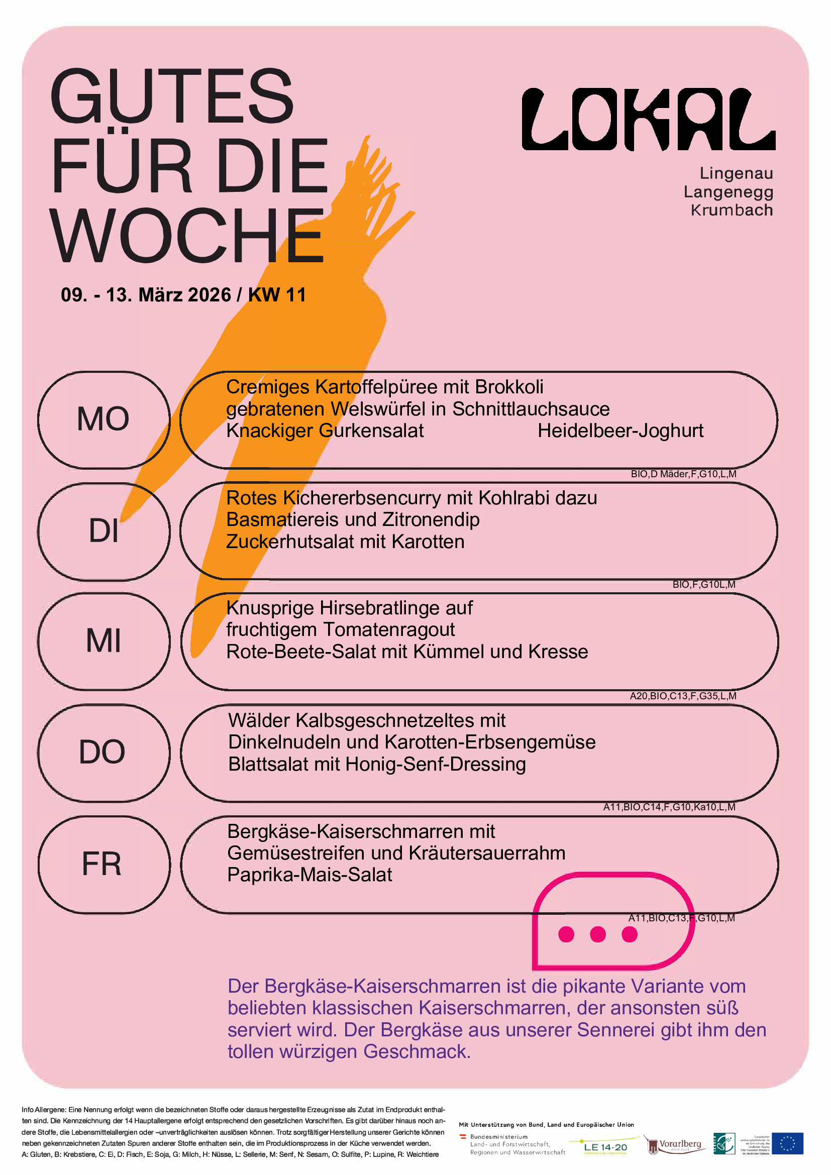 Der Speiseplan für die Folgewoche ist ab Donnerstag Abend hier veröffentlicht. Das Küchenteam legt Wert auf Abwechslung mit möglichst regional, saisonal und nachhaltig erzeugten Lebensmitteln. Fertiggerichte, Soßenpulver und Fertigwürzen werden in den LOKAL Küchen nicht verwendet. Die Menüs werden täglich frisch zubereitet.